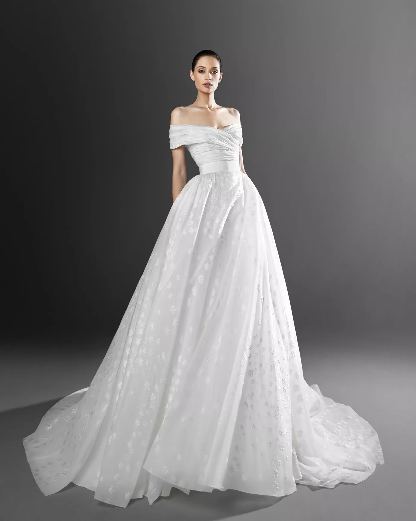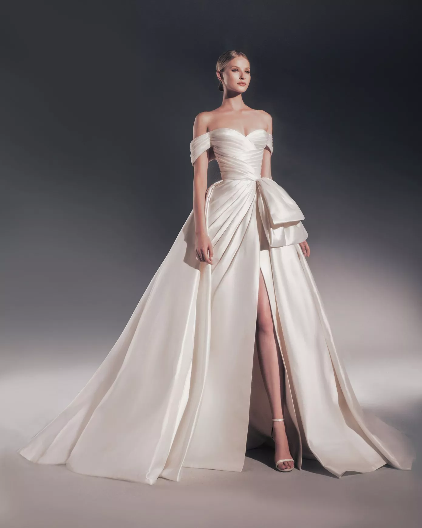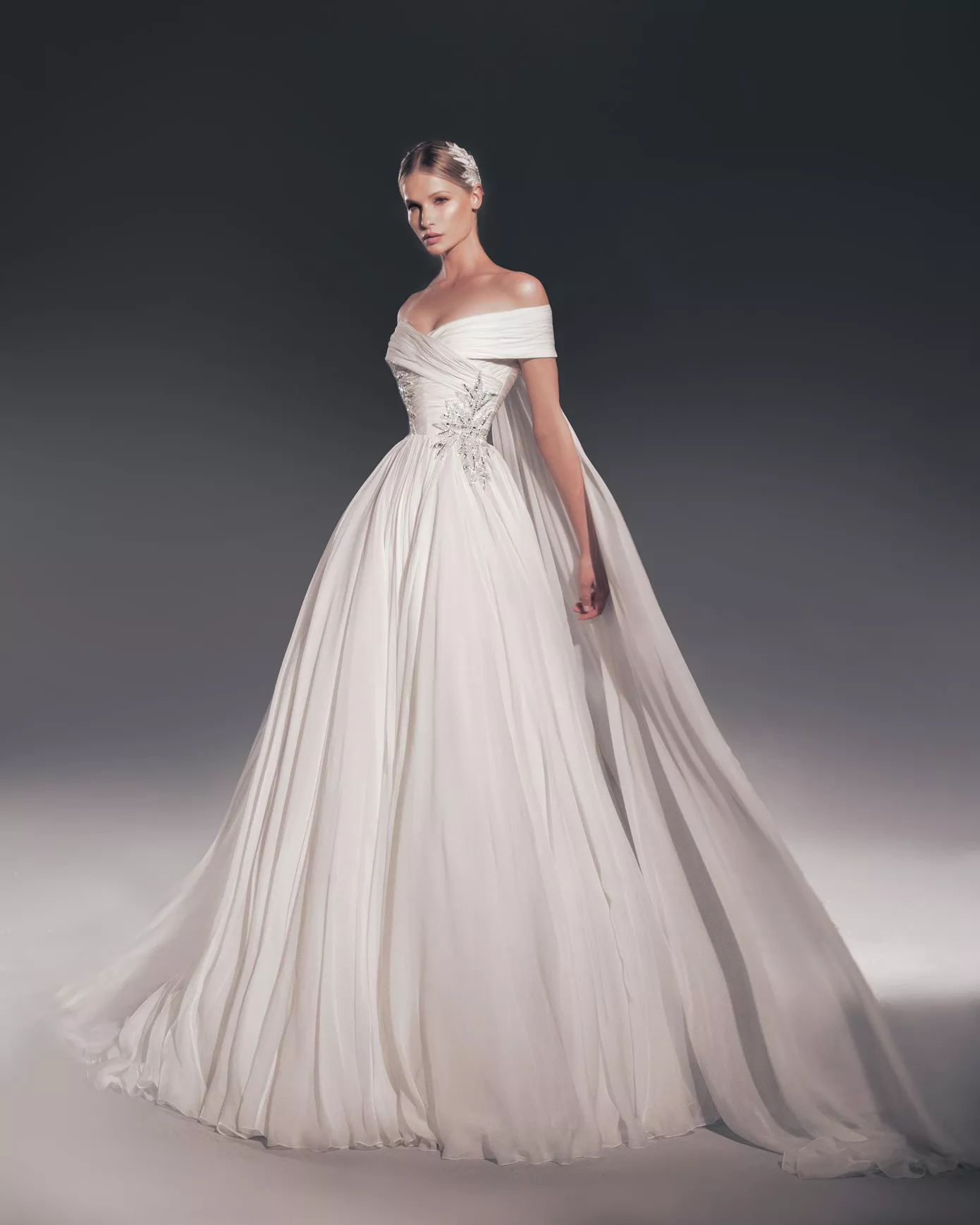 Look 12: Off-the-shoulder A-line gown.