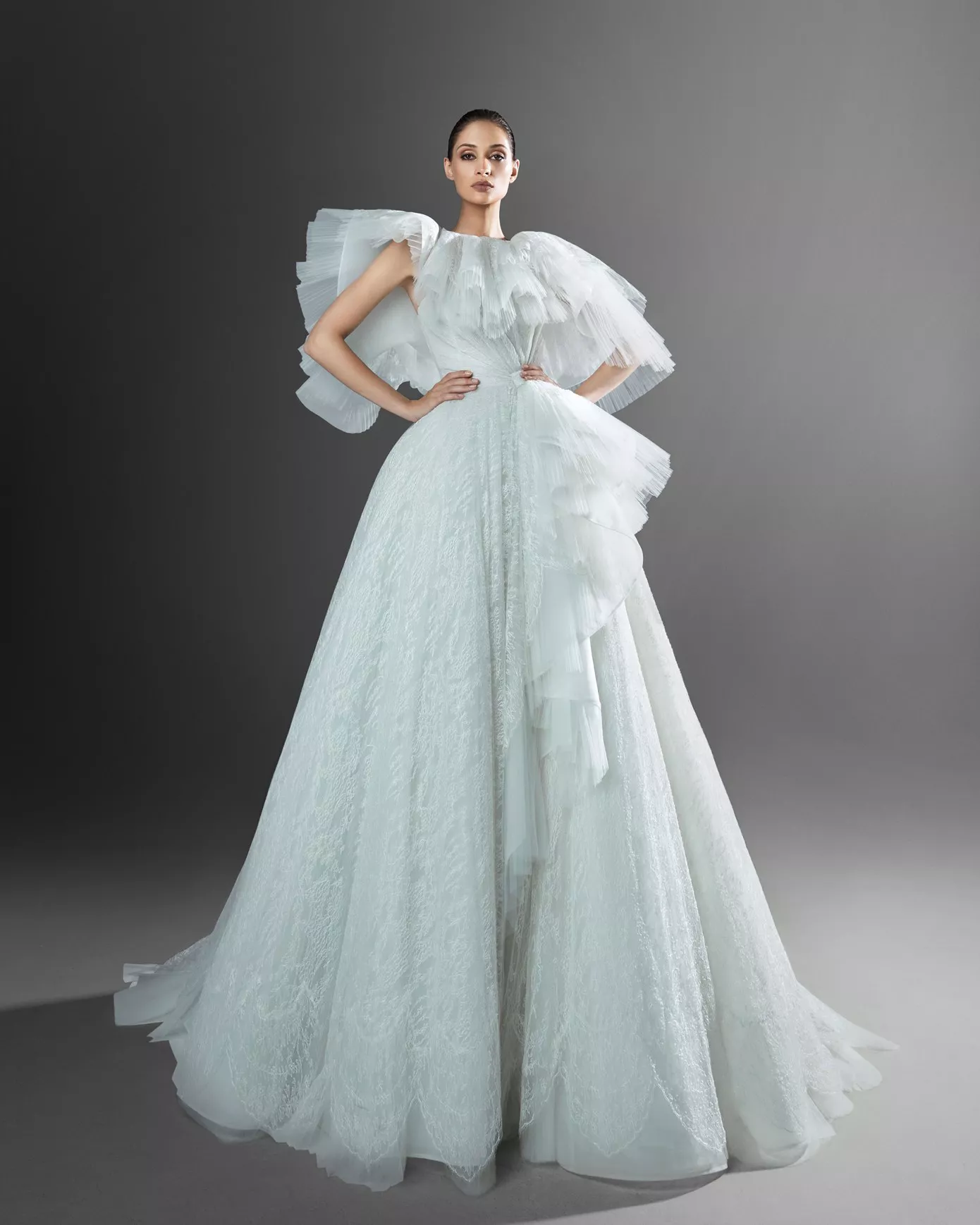 Look 5: Light teal ruffle ballgown.