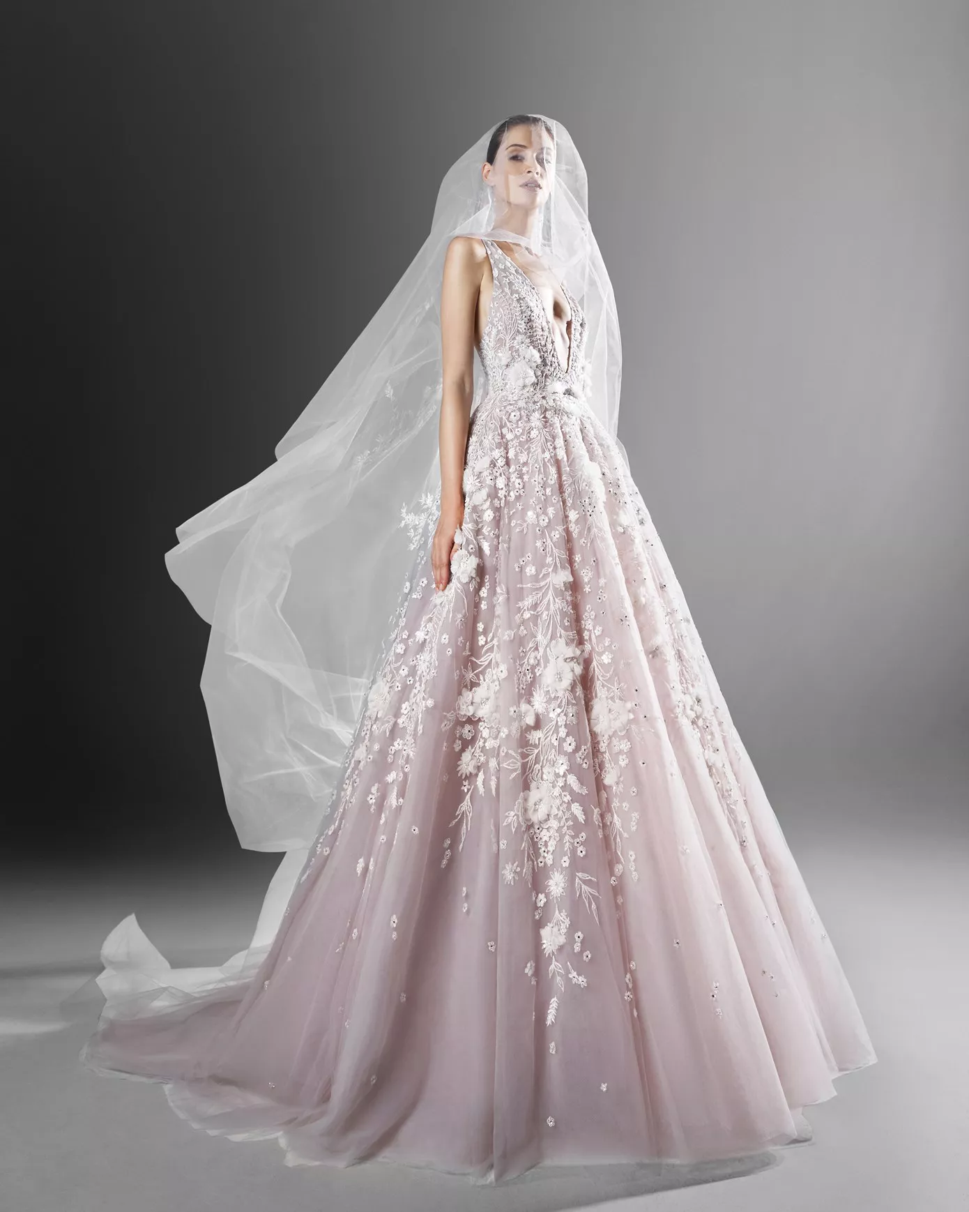 Look 3: Blush pink A-line gown with a plunging deep-V neckline.