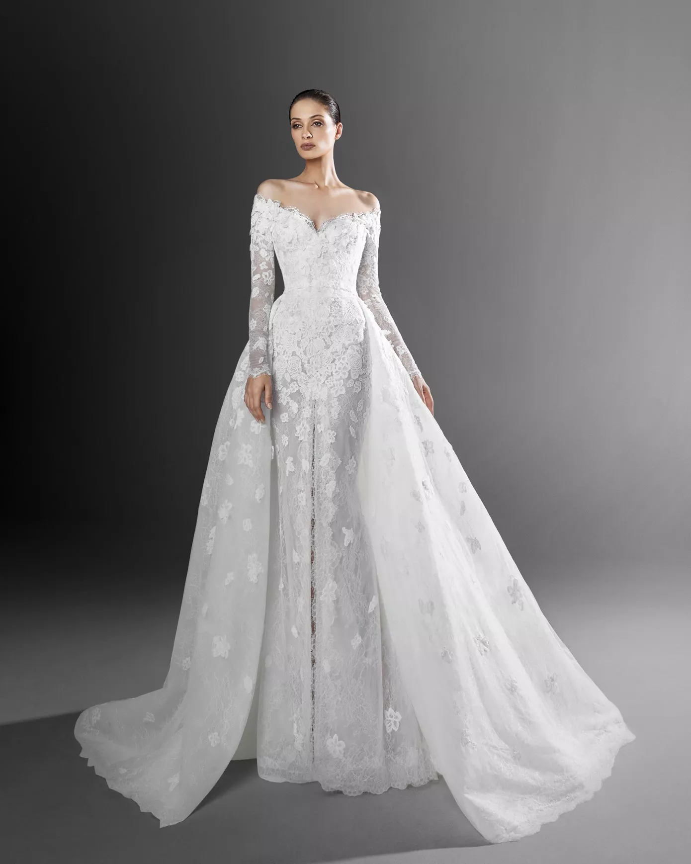 Look 8: Long sleeve off-the-shoulder gown with an overskirt.