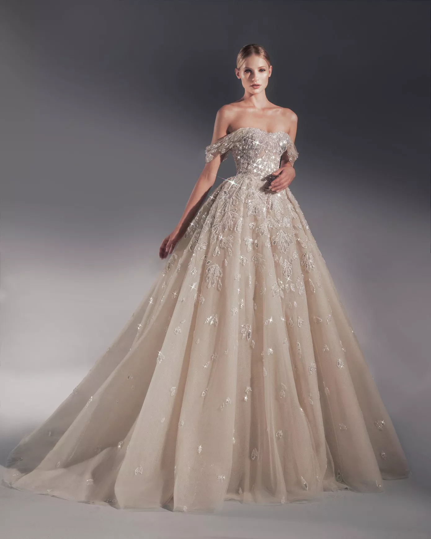 Look 14: Off-the-shoulder sequin ballgown.