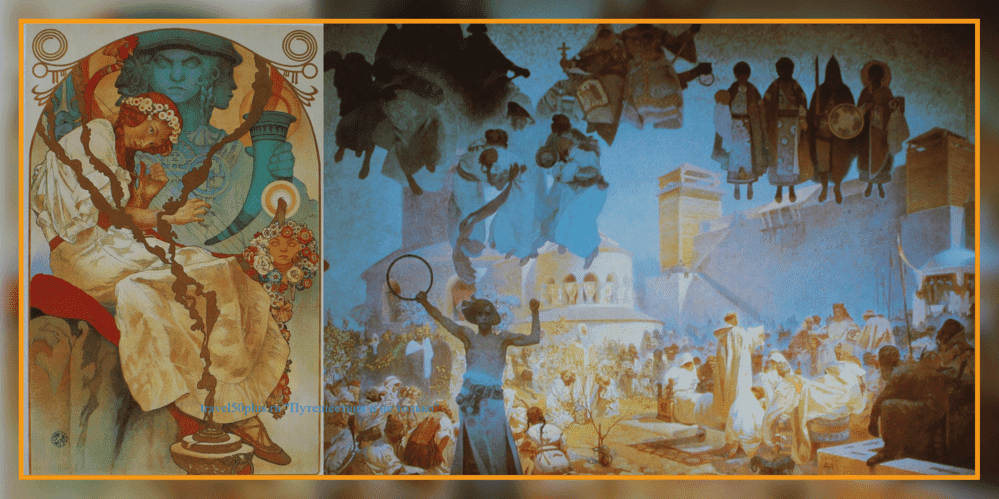 В 1900 г. Муха принял участие в оформлении павильона Боснии и Герцеговины на Всемирной выставке в Париже. В ту пору он заинтересовался историей славян, что стало поводом создания цикла «Славянская эпопея». С 1904 по 1913 гг. Муха много времени проводит в Америке, декорирует дома, создает иллюстрации для книг и журналов, афиши и эскизы костюмов для театральных постановок, читает лекции в Институте искусств в Чикаго. А после решает вернуться в Чехию и в течение 18 лет работает над «Славянской эпопеей».