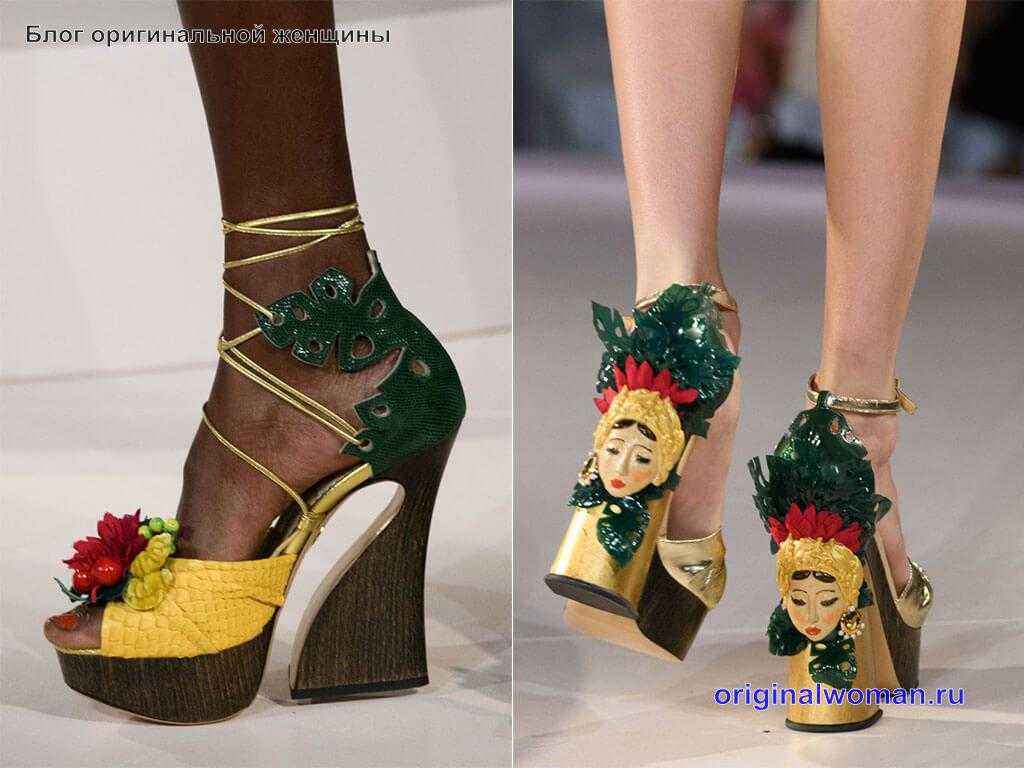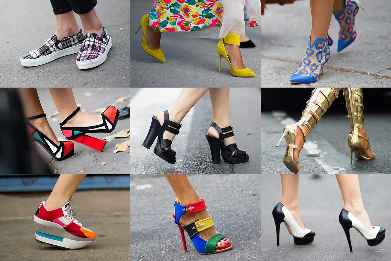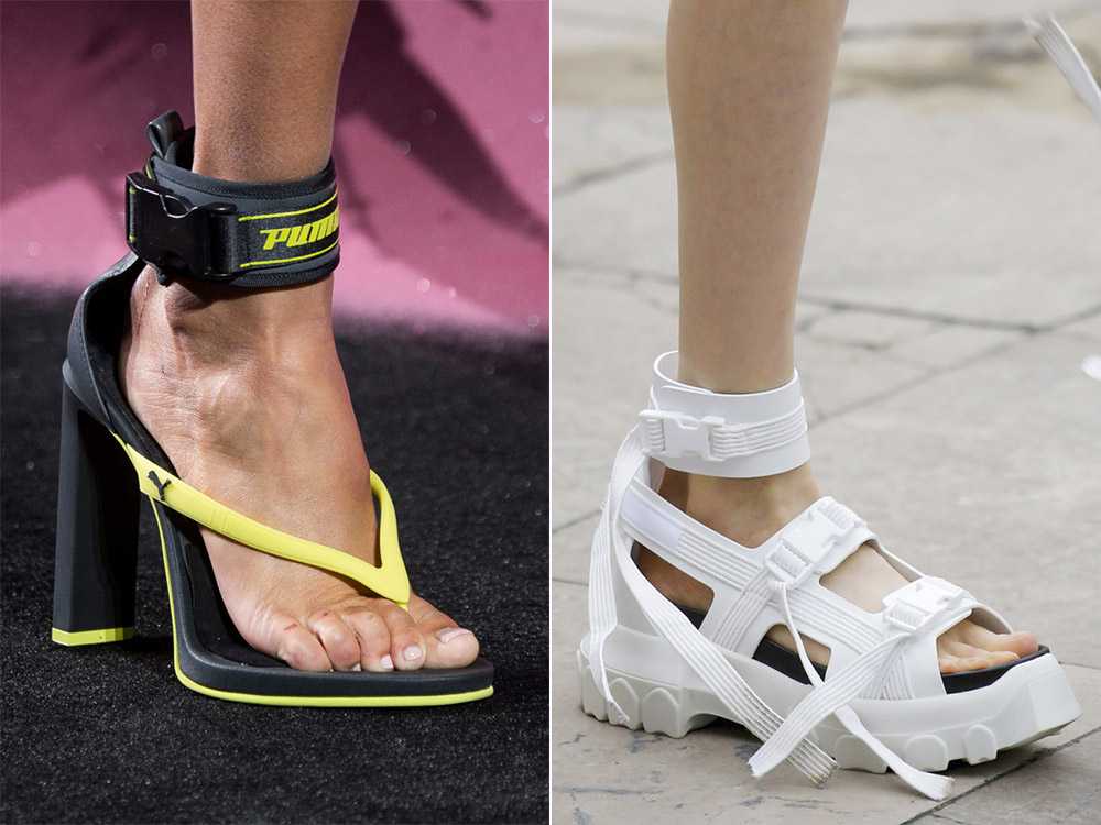 Обратите внимание на трендовые детали: окрашивание кожи в яркие тона, наличие ремешков и массивный каблук