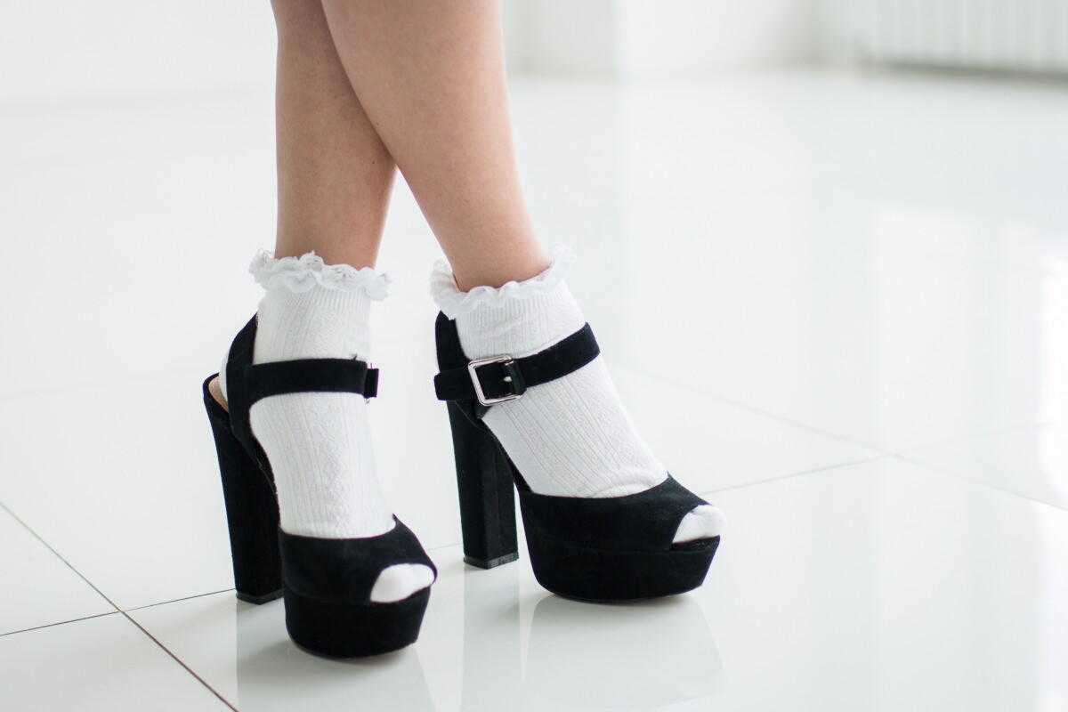 - Толстый каблук в сочетании с массивной обувью тёмного цвета делает вашу ногу крупнее. Не стоит выбирать такую обувь, если вы обладательница полных ног.