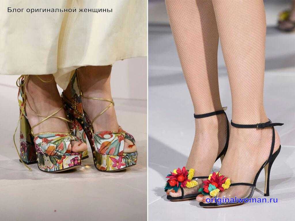 Растительные орнаменты. Не обойтись этим летом и без флористических принтов, которые будут украшать не только одежду, но и обувь. На босоножках они могут присутствовать в качестве небольших декоративных вставок или покрывать полностью все изделие.
