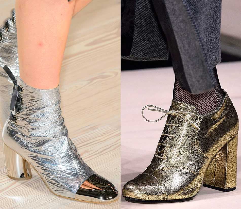 Металлик. Босоножки, выполненные в золотом или серебряном цвете, помогут создать вам поистине модный и запоминающийся образ. Что касается фасонов, это могут быть нарядные вечерние варианты, повседневные модели на танкетке или низком ходу.