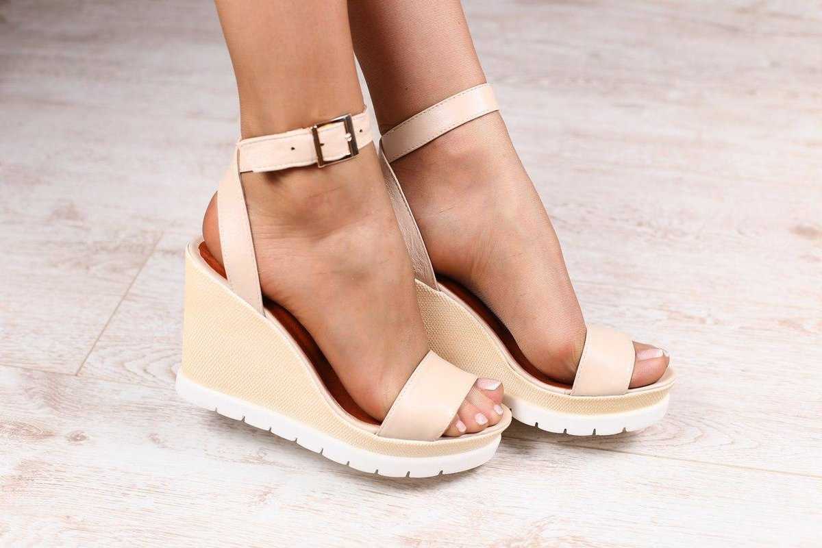 Кожаные босоножки на танкетке и фото моделей на женской ноге