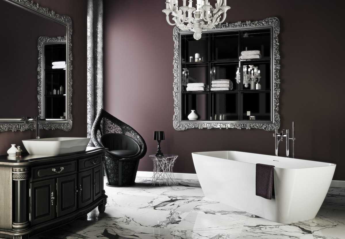 Вполне современная ванна хорошо вписывается в интерьер, возможно, благодаря своим подчеркнуто минималистским очертаниям, которые не отвлекают внимание от выразительных деталей.