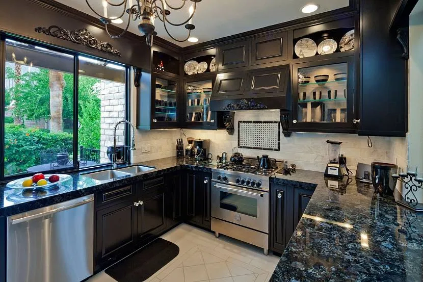 На небольшой готической кухне гарнитур можно разместить по периметру всей комнаты, при условии, что обеденная зона находится в другом помещении. Для оформления идеально подойдет черный кухонный гарнитур со столешницей под камень, панели верхних шкафов содержат стеклянные вставки с подсветкой. В центре белого потолка хорошо смотрится массивная кованая люстра. Сделать освещение более ярким можно с помощью галогенок, расположенных по периметру. Кухонный гарнитур из массива может иметь высокую стоимость, его можно заменить искусственным материалом, декорированным под дерево.