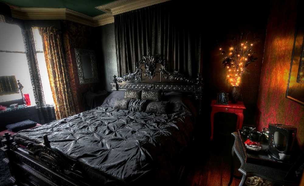 - Он подчеркивается необычным светильником, на ветвях которого расположились светящиеся колючие шарики. В этой комнате все работает на впечатление – и зеркало в широкой серебристой раме, и черное шелковое белье, и декоративные подушки с угольно-бархатистыми узорами на золотом фоне. Даже некоторый беспорядок в комнате лишь помогает восприятию, подчеркивая некоторые напряжение, характерное для готики.