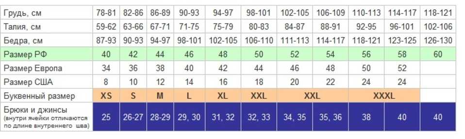 Размеры брюк, джинс и штанов учитывают обхват бедер (другими словами полноту) и длину. Размерная таблица представлена ниже.