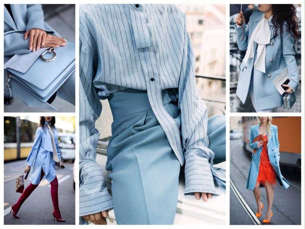 Этот цвет сочетается практически со всеми другими оттенками. Нежности образу придаст сочетание белого с голубым. Чтобы добавить яркую нотку в строгие осенние мотивы, выбирают черный цвет. Для делового наряда подойдет сочетание голубого и серого. Этот цвет также сочетается с розовым, желтым, бежевым, бордовым, красным и синим.