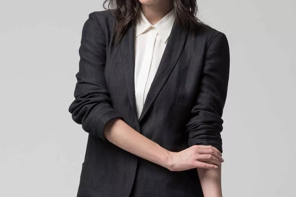 - Пиджак темного оттенка из плотной ткани, сидящий по фигуре.