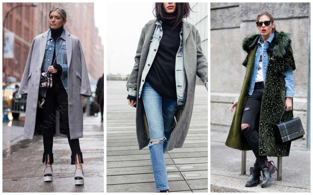 Примеры многослойности верхней одежды: джинсовая куртка и пальто; джинсовая куртка и тренч, джинсовая куртка и шуба
