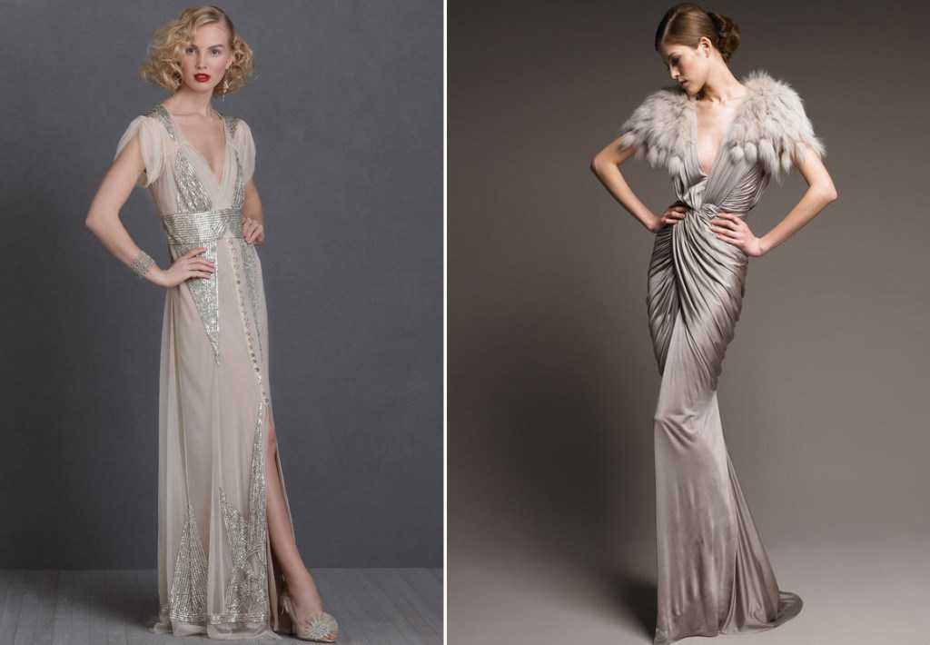 В эти годы мода отмечалась на вечерние одеяния с глубоким вырезом в области спины. Подобные платья не оснащались застежками и идеально подходили для худощавых девушек. Дополнялся при этом образ с помощью накидок или же боа из меха. Если же женщина не могла позволить себе меховые изделия, предпочтение отдавалось пелеринам из бархата, шифоновым шалям и шарфам.