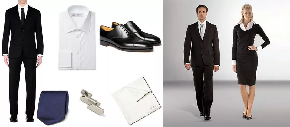 Рекомендации для мужчин: самый строгий и консервативный костюм чёрного, серого или тёмно-синего цвета; белоснежная рубашка c двойными манжетами и запонками; исключительно чёрные туфли – дерби или оксфорды. У женщин это синий, серый или бежевый костюм; белая блуза; телесного цвета чулки или колготки; чёрные туфли-лодочки на каблук от 3 до 5 см; единственно допустимая причёска – собранные волосы; отсутствие короткого рукава в любое время года; допускается разнообразить костюм шейным платком или ювелирными украшениями маленьких размеров.