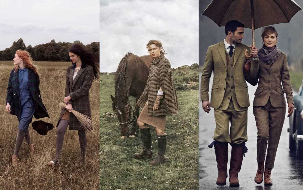 Твидовый пиджак, клетчатый шарф, резиновые или кожаные высокие сапоги, аксессуары из коричневой кожи.