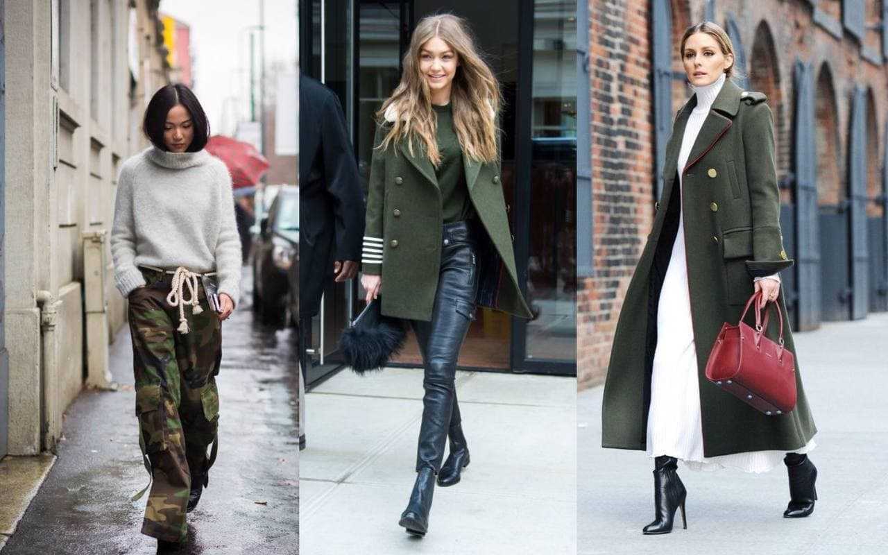 Тренч, армейские ботинки, пальто-бушлат, куртка-бомбер, брюки-карго, защитный принт на одежде и аксессуарах.