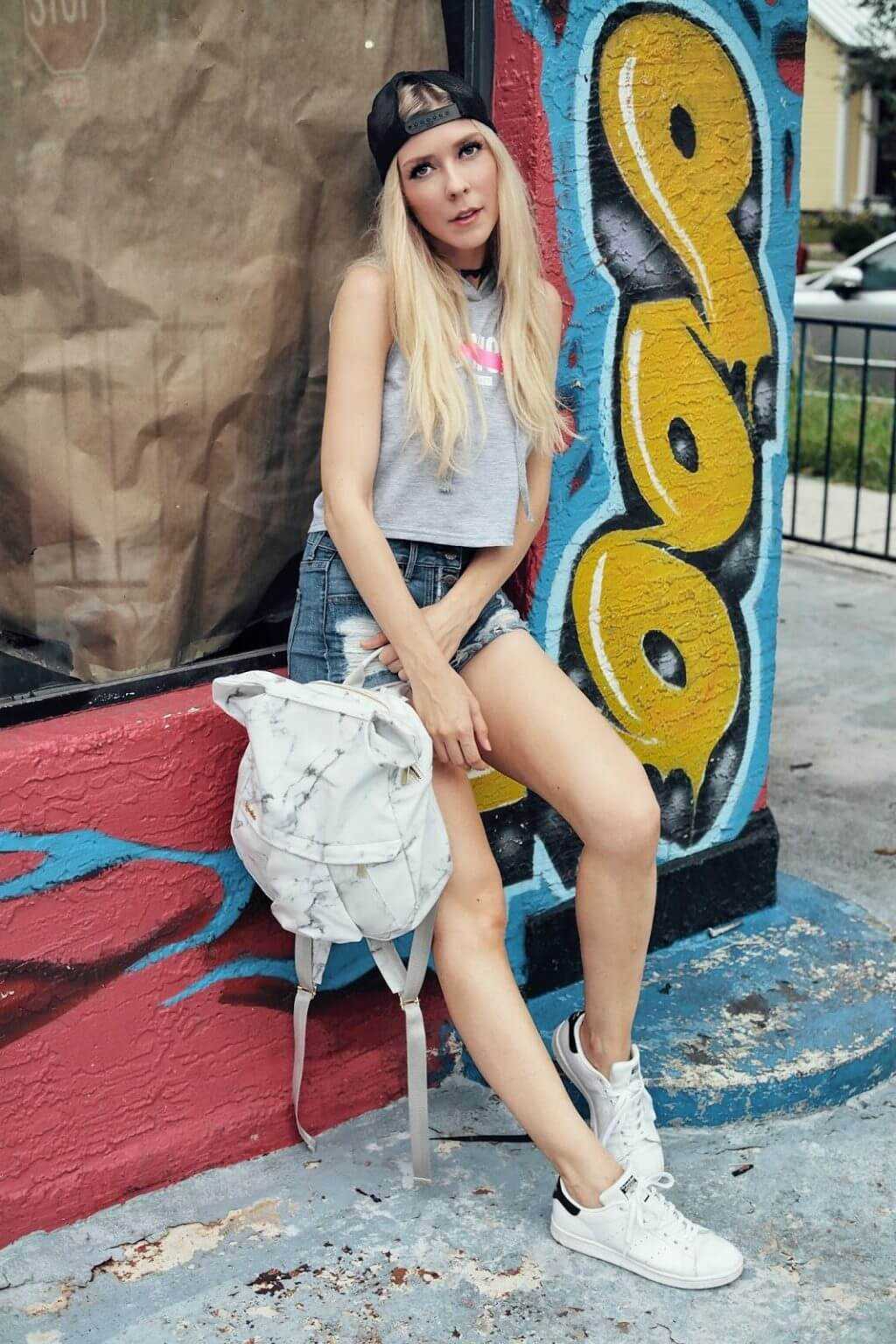 Вещи, которые чаще всего встречаются в этом стиле, – это спортивные штаны, джинсы, кроп-топы, свитшоты, футболки, худи, кроссовки и даже обувь на каблуке. Не стоит только путать вещи для занятия спортом (леггинсы, кроссовки для бега) и вещи из категории спорт-шика. В качестве аксессуаров используют рюкзаки, поясные сумки, очки, бейсболки. Характерными цветами являются более сдержанные оттенки – черный, серый, белый. Но в качестве акцентов часто используют и вещи очень ярких цветов. Возможным в этом стиле является использование интересных принтов (чаще всего это полосы) и даже спортивных надписей.