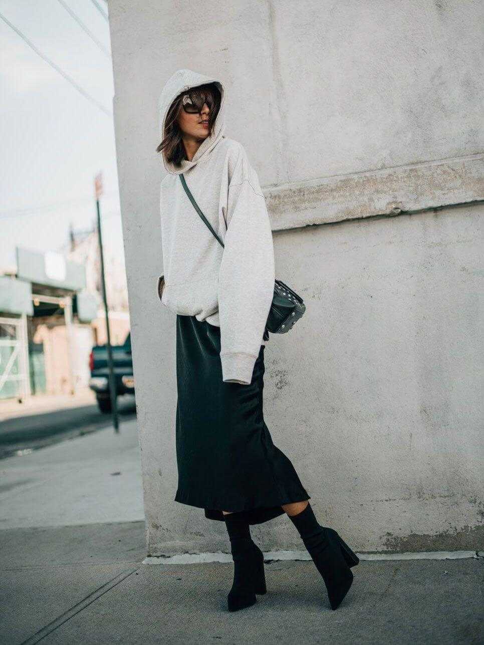 Однако составить образ с юбкой можно сложнее и многослойнее. Для этого к юбке подбери худи или свитшот. Обувь – либо туфли на каблуках, либо уже упомянутые кроссовки.