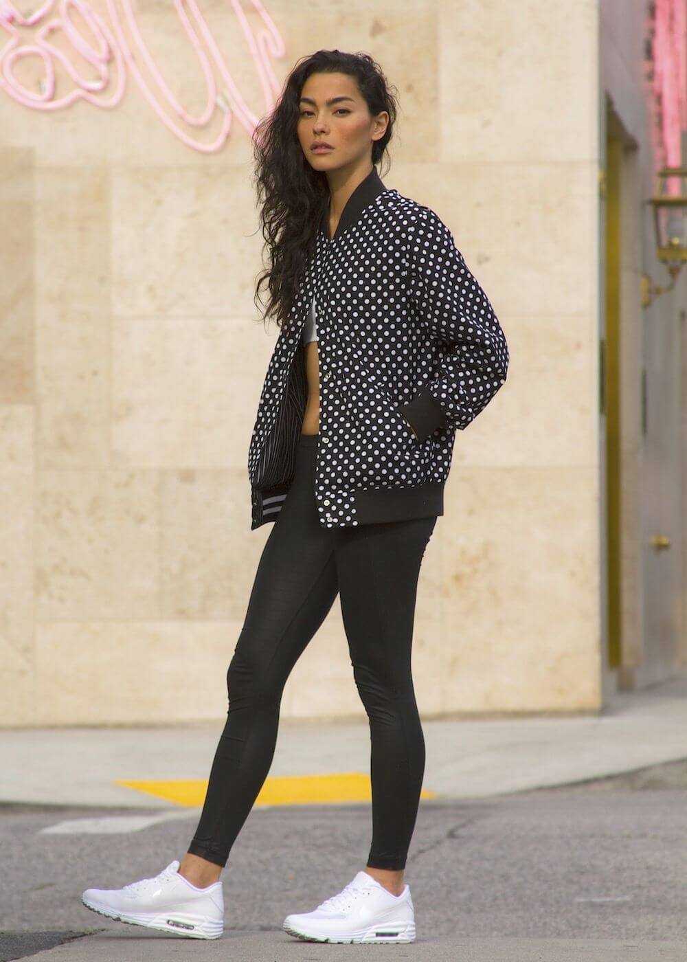 Ваш лук в стиле спорт шик может быть очень дерзким! Все, что вам нужно, это сочетать спортивные кеды со спортивными штанами в мелкую клетку, серой футболкой и черной кожаной курткой: