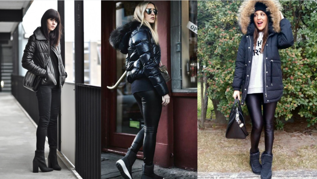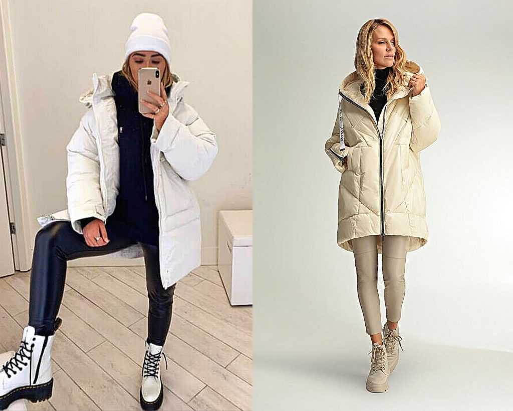 Зимой мы можем смело использовать с пуховиком кожаные джинсы и леггинсы. Дополнением будут сапожки на плоском каблуке, шапка бини, мягкая удобная сумка. Объёмные формы куртки придадут силуэту новизну и дерзость.