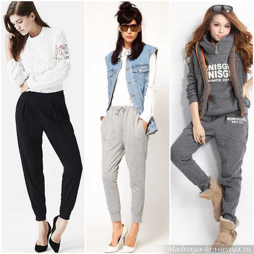 Сегодня спортивные штаны модно носить с яркими толстовками, трикотажными свитерами грубой вязки, классическими пиджаками, кожаными курточками, кардиганами, мужскими рубашками и женственными кофточками. Арсенал обуви тоже велик: туфли на каблучке, ботильоны, босоножки, ботинки на шнуровке, сапожки с широким голенищем, балетки, сандалии и все, что душе угодно!