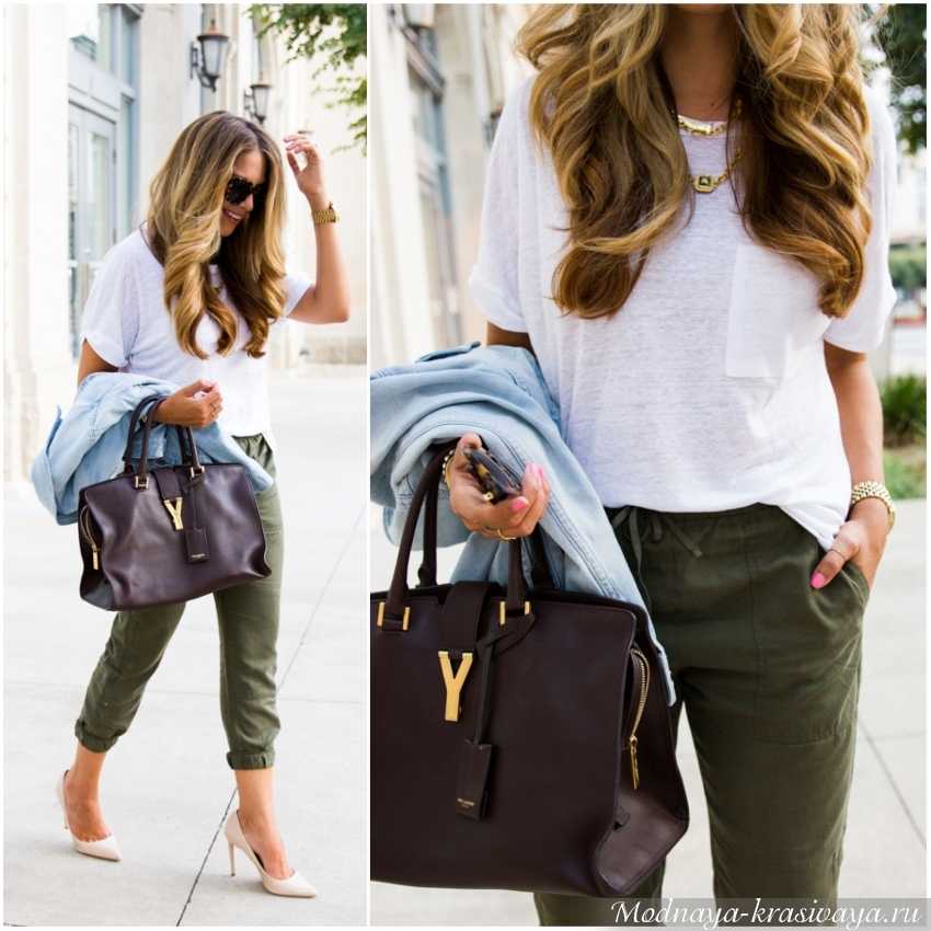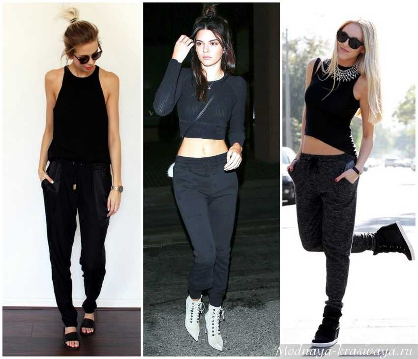 Брюки спортивного стиля превосходно сочетаются с натуральными футболками, укороченными топами, рубашками, свободными майками, стильными облегченными свитшотами. Самая подходящая обувь — это полукеды и кроссовки.