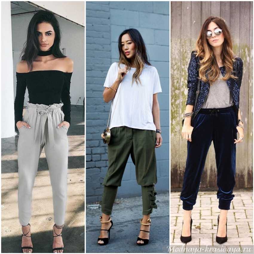 штаны-джоггеры — эта модель отличается утягивающими резинками на манжетах. Их носят как немного короткие, подтягивая штанины так, чтобы часть от колена до щиколотки была присобрана