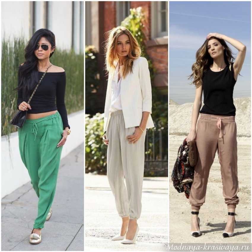 широкие, или как их еще называют, брюки-шаровары — чаще всего они с резинкой внизу, хотя есть варианты и без. Отлично смотрятся на всех, поэтому так популярные изначально у реп-исполнителей они быстро перекочевали в повседневную женскую моду.