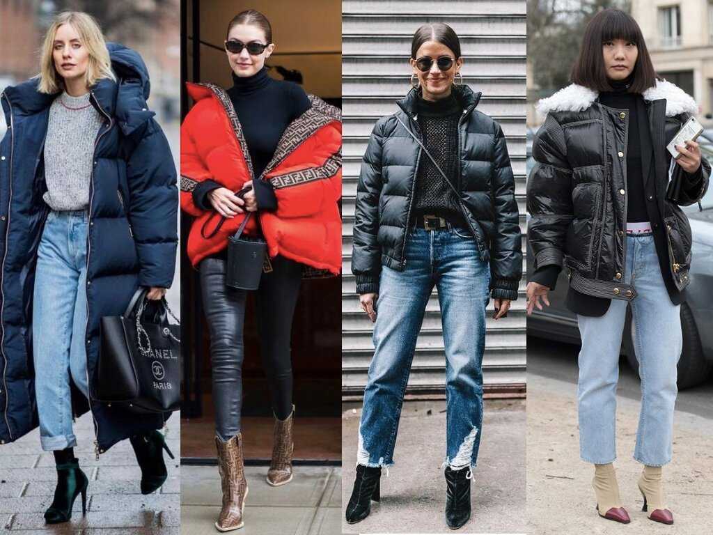 Джинсы отлично вписываются в пуховый ансамбль. Какого бы необычного оттенка ни была ваша куртка, сдержанная классика джинсовой ткани, всегда уравновесит веселое буйство красок. Единственно надо помнить, что укороченные брюки зрительно делают ваш рост меньше. Поэтому: или брюки до стоп, либо сапоги до колен на высоком каблуке.