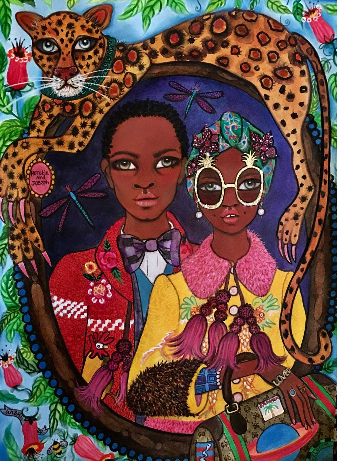 В улетной картине молодые люди, полные надежды, с блестящими глазами, в ярких пальто, на фоне вальяжно развалившегося спутника опекуна – леопарда, тотемного зверя. Это больше, чем иллюстрация моды: это рассказ о двух карибских иммигрантах в Великобританию в 1940-х годах.«Они были смелы и радостны и нарядились в лучшее для исхода с корабля» объясняет художник.