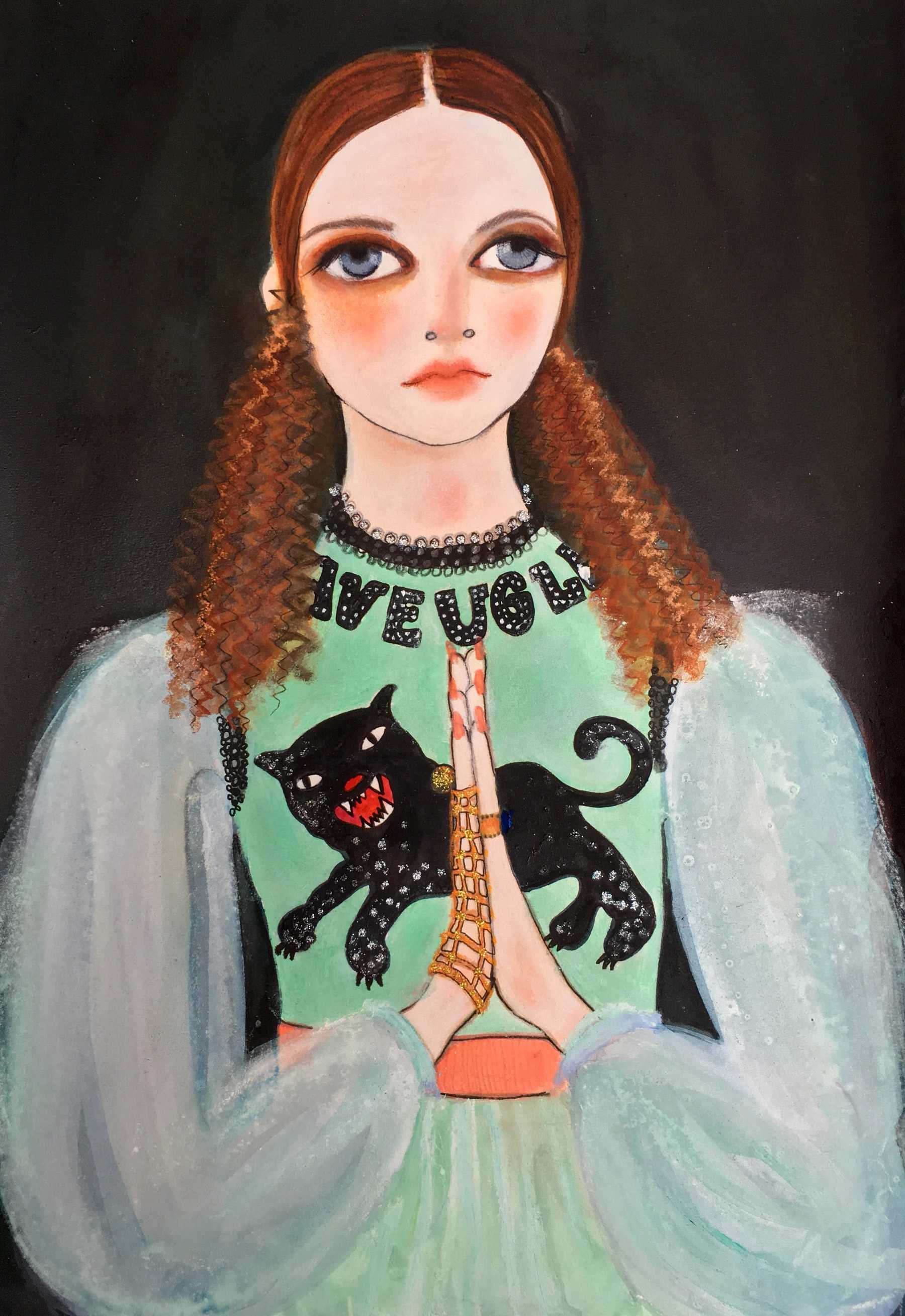 Затем она была приглашена на Неделю моды Гуччи – зима/осень 2015 и создала четыре картины. «Я была ошеломлена. К тому времени, как третья модель вышла на подиум, мне хотелось плакать,» говорит Хелен.