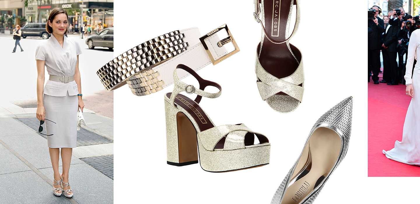 Светлые наряды актриса любит дополнять блестящей, в прямом смысле слова, обувью. Серебряные или покрытые разноцветными пайетками туфли выступают в роли аксессуаров.