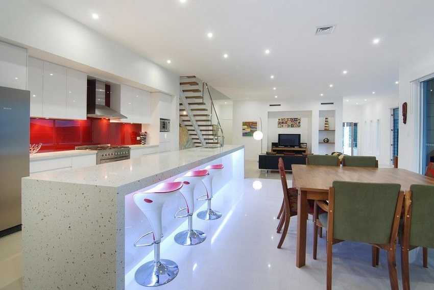 Белая кухня в стиле модерн, как правило, разбавляется цветовыми акцентами