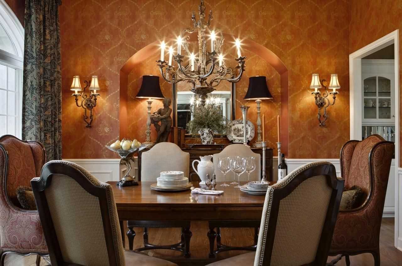 Последним штрихом в готическом интерьере станет освещение: как правило, это массивная люстра с коваными подсвечниками. Ее вешают по центру комнаты и дополняют светильниками и бра.