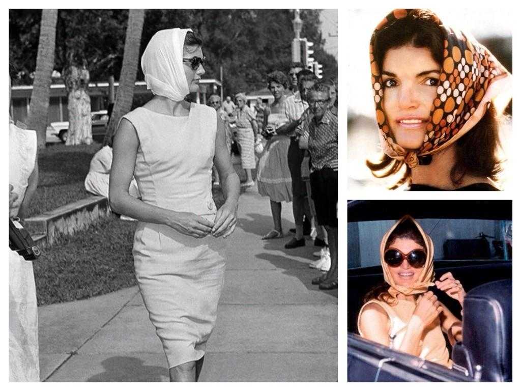 Шелковые платки. Элегантные шелковые платки от Hermes Жаклин носила самыми разнообразными способами: на шее, на плечах или повязывала на голову.