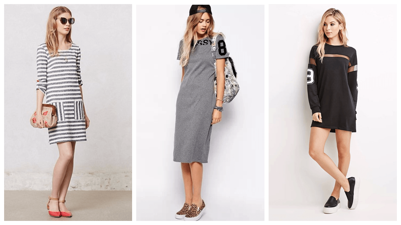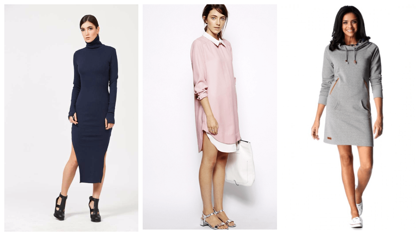 К этой категории можно отнести платья-свитера. Удобные и практичные, эти модели самые теплые из всех вышеперечисленных. Стандартная длина мини, но бывают и миди варианты. Стильно выглядят удлиненные до колен худи с капюшоном и карманом-кенгуру. Это выбор молодежи. Преимущество в том, что носить такие теплые модели можно с плотными колготами или леггинсами.