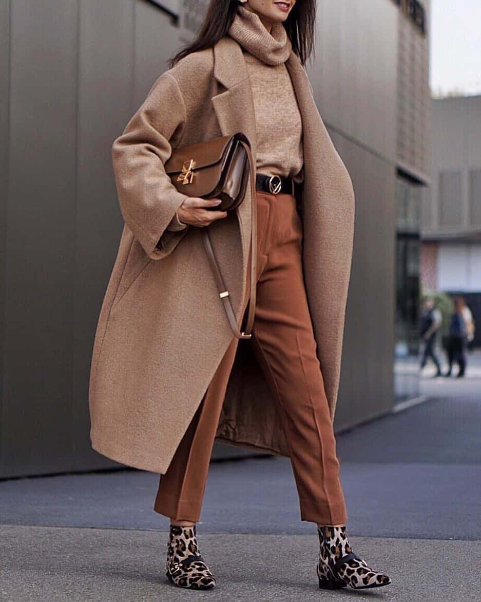 Для осени и зимы текущего года актуальны базовые тона: светло-песочный, оливковый хаки, черно-синий и безупречно серый. Плащ или пальто, свитер с объемным воротом, классические брюки — вещи в единой цветовой палитре создадут завершенный и стильный облик.