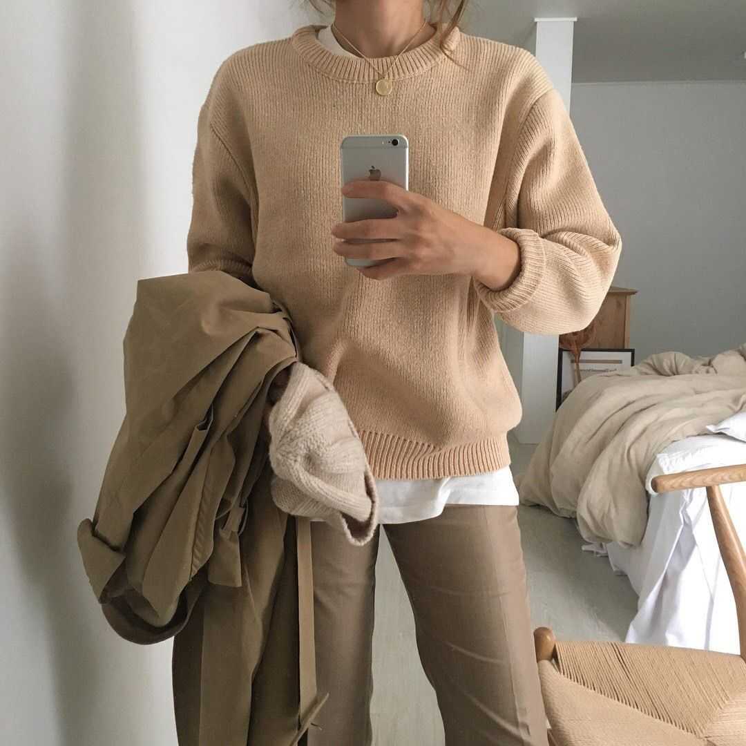 Бежевый — один из самых популярных оттенков, теплый и элегантный, подходит для романтического свидания и деловой встречи. Вязаный свитер оранжевый беж в сочетании с молочно-бежевой блузой или футболкой, классические брюки и серо-бежевый тренч создают многослойный вариант. Пуловер оттенка беж в комбинации с атласным платьем делает силуэт мягким и женственным.