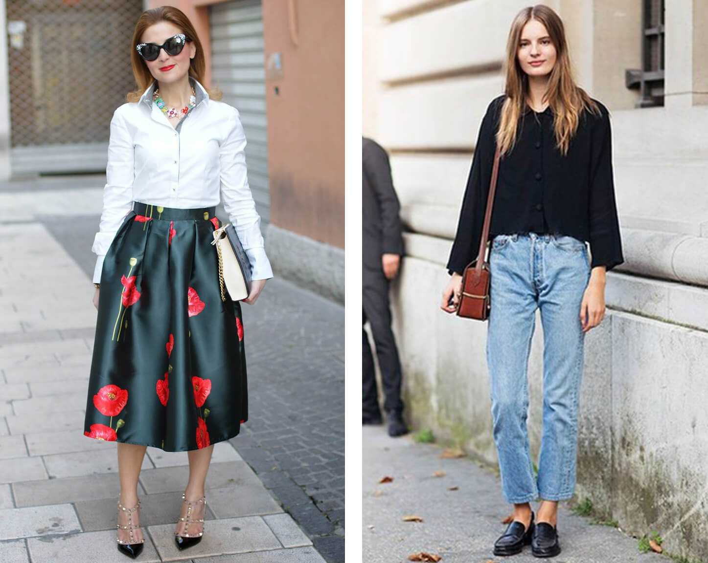 Есть классические «дуэты», например, со свободной рубашкой надевают зауженные брюки, а к широкой юбке подбирают приталенную футболку или блузу.