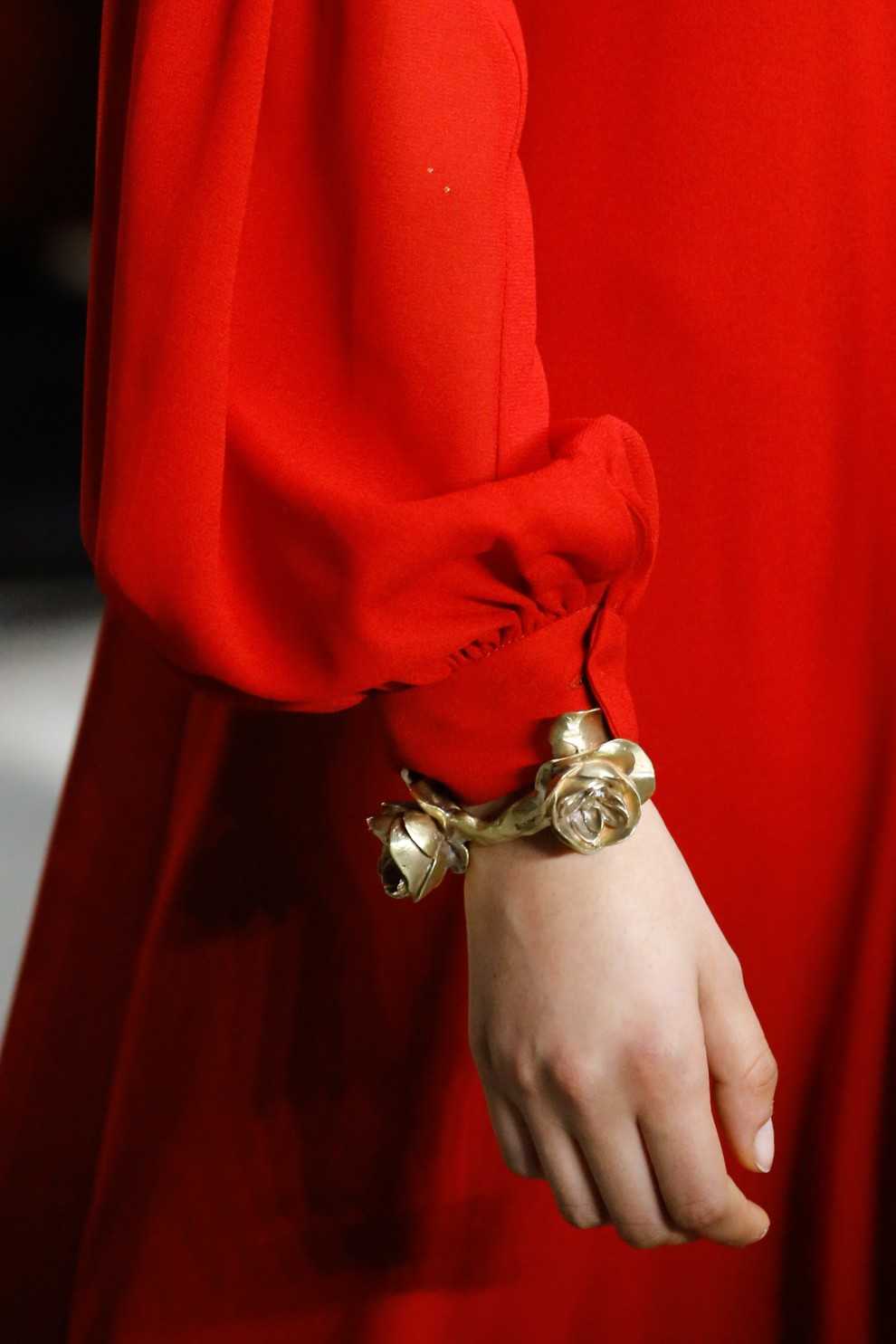У Brandon Maxwell – сверкающая серебристая цепь, дважды обмотанная вокруг шеи. Аксессуар дополнен браслетом в аналогичном дизайне: