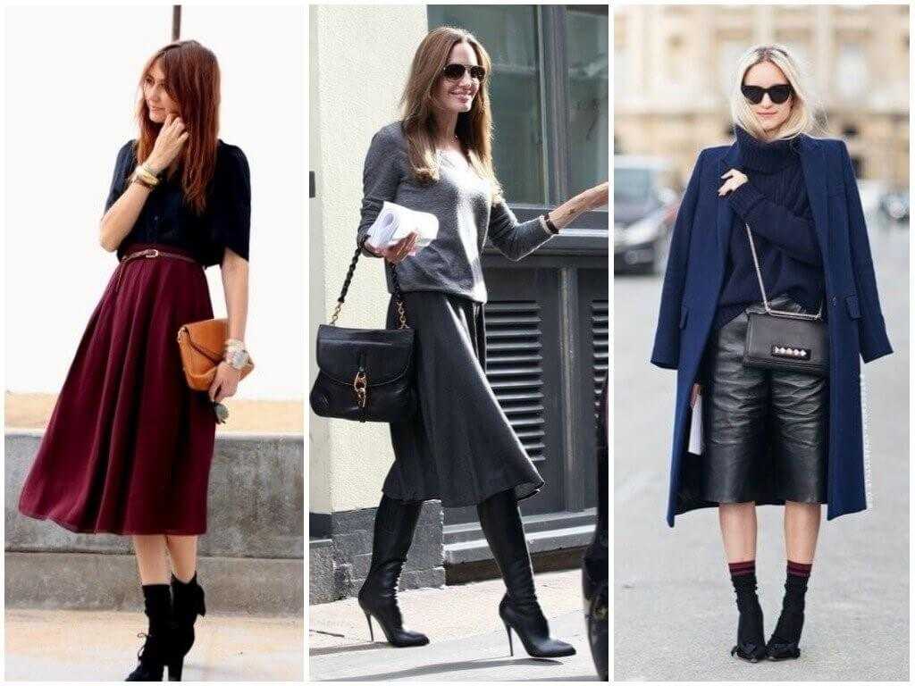В качестве образа для холодного времени года можно рассмотреть элегантные сапоги-трубы и стильные ботильоны. Смелые девушки успешно комбинируют годе с ботинками на массивной платформе, такой лук лучше дополнить укороченной мужской косухой.