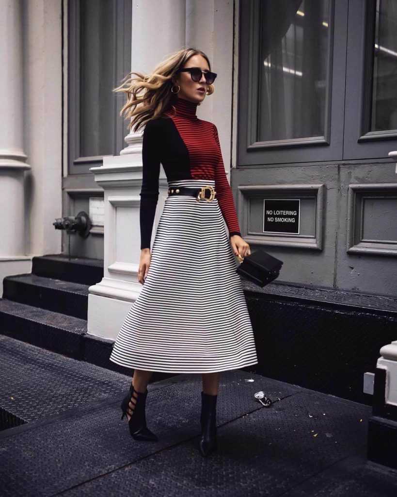 В прохладное время годе отлично дополняются свитерами и водолазками, более подходящими будут облагающие модели. Однако эффектные аутфтиты можно создавать и с объемным верхом, но при этом свитера или блузки оверсайз должны быть укороченными.