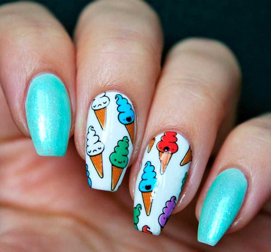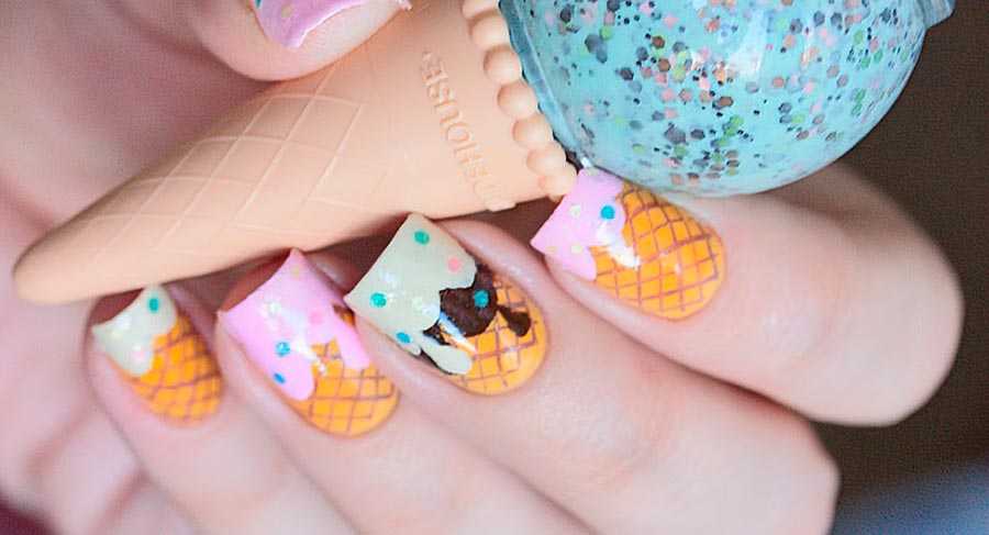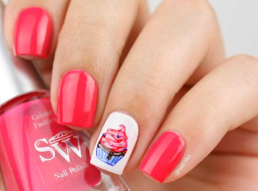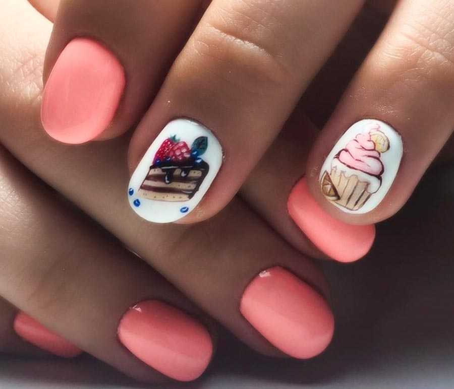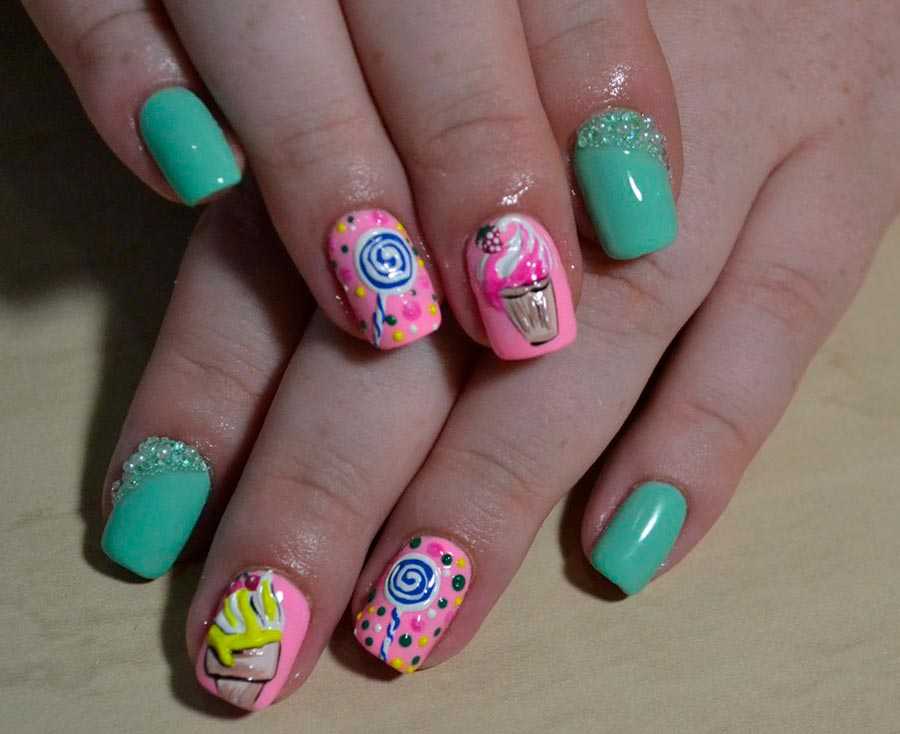 Впрочем, конфеты и карамельки заслуживают «жить» на ваших ногтях и совсем отдельно — в качестве рисунка на ногтевой пластине. Очень просто исполнить такой узор в виде конфет в обертках, карамелек, даже мороженого капкейка или других сладостей. Такой дизайн отлично подойдет для летнего маникюра — он добавит беззаботности и настоящего настроения каникул. Да, в офис разноцветный маникюр вы вряд ли сделаете, но на время отпуска или морского отдыха его вполне можно будет себе позволить.