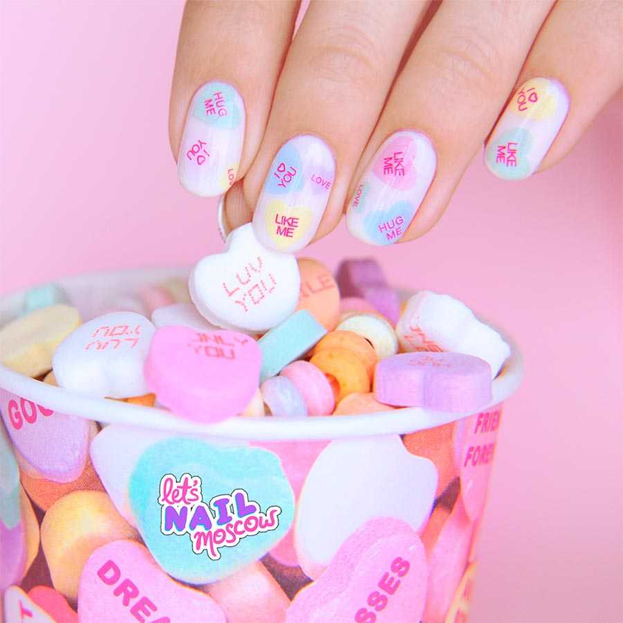 Рисунки можно выполнить не только на длинной ногтевой пластине, но и на короткой длине ногтей. Рисунок может присутствовать только на одном пальце, или же на каждом — тут все зависит от вашего желания и фантазии. В качестве фона для конфетных рисунков рекомендуется выбирать традиционный белый цвет. Он напоминает белый лист бумаги, а потому подойдет для выполнения рисунка или узора любым цветом. Можно выбирать и пастельные светлые тона — голубой, розовый, лавандовый, и те же нюдовые бежевые и кремовые оттенки.