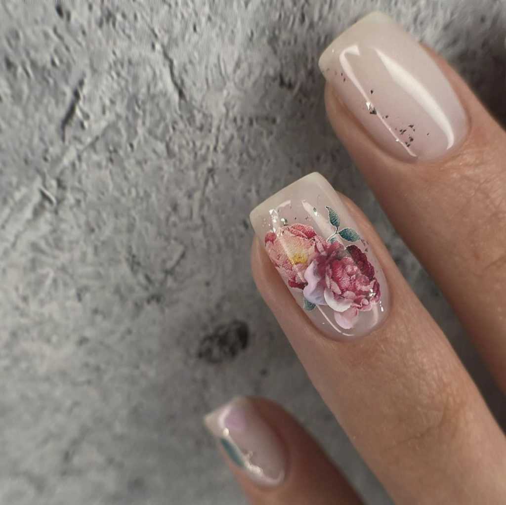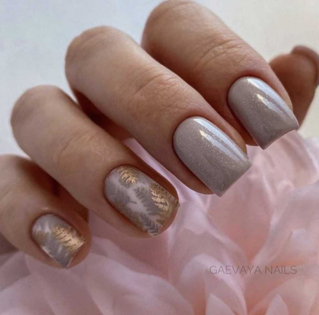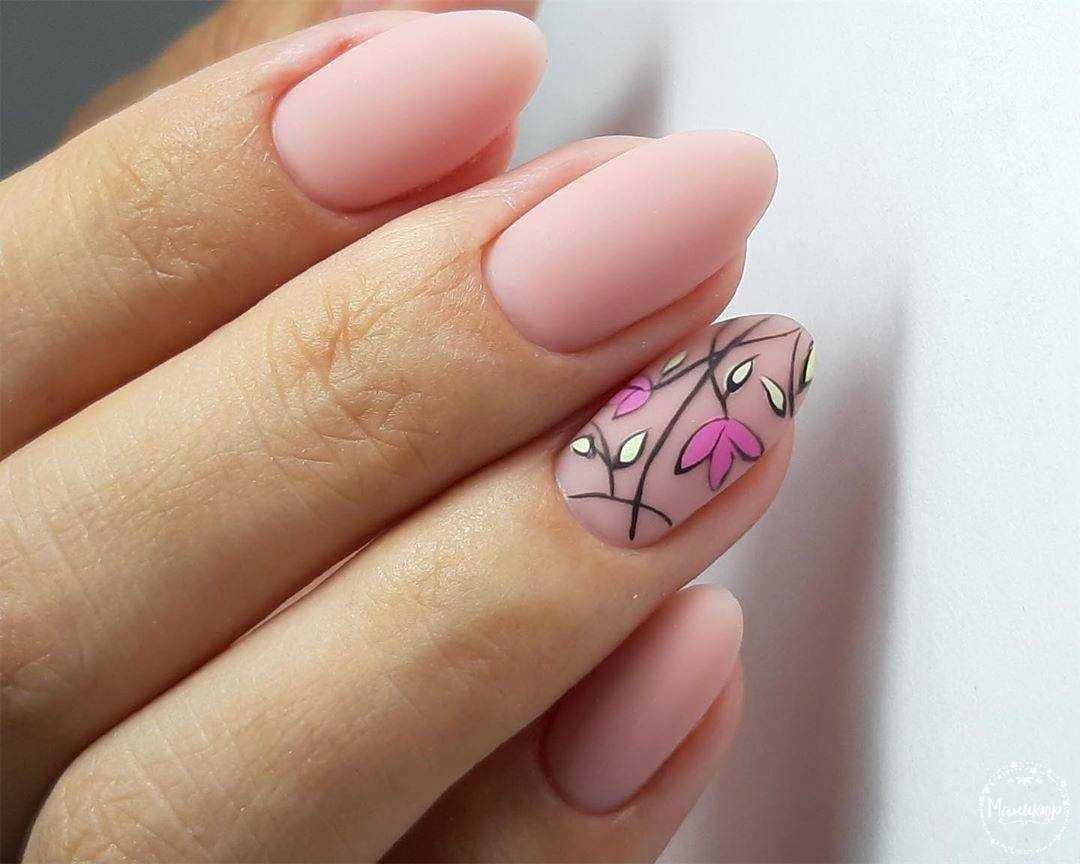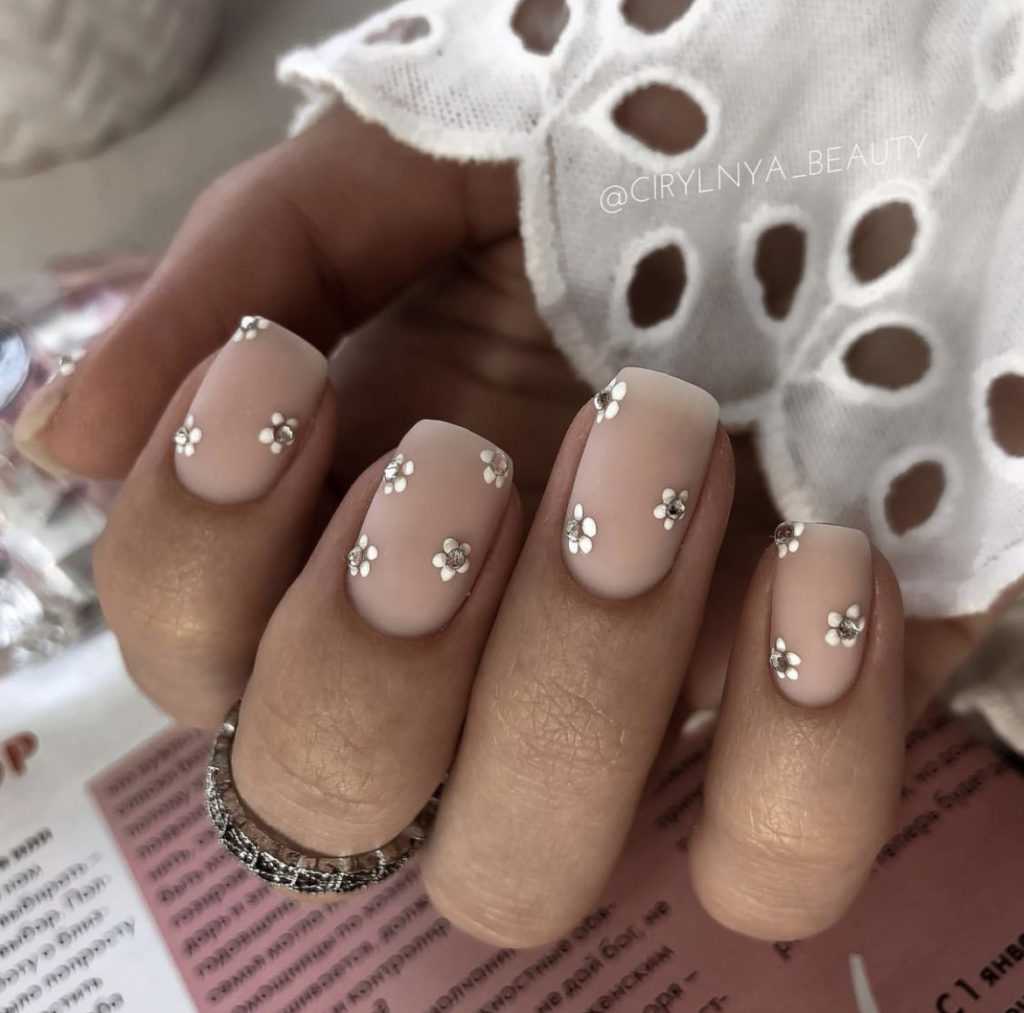 Не обязательно ограничиваться однотонным покрытием. Нейтральный цвет лака может отлично подружиться с минималистичными или флористичными рисунками, вставками из фольги или миниатюрных страз.