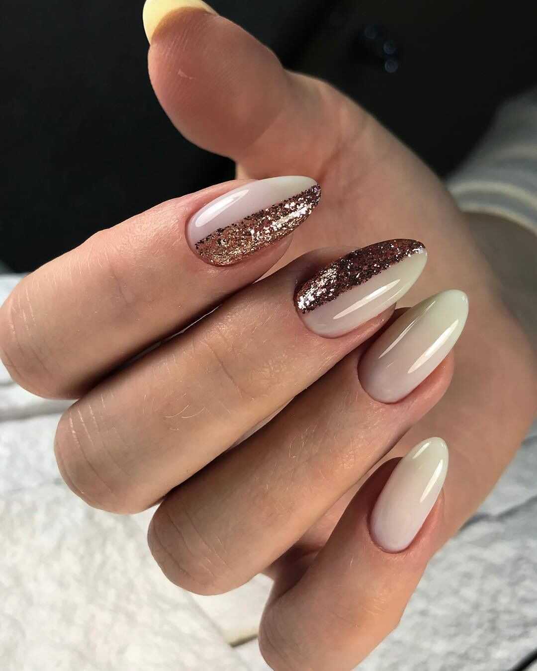 Для еще одного вида маникюра с блеском понадобиться золотистый глиттер, которым полностью покрывается один из ноготков, тогда как на других этот лак используется хаотично и создает эффект потертости на коричневом фоне. Одна-две поперечные золотистые полоски фольги украшают и отлично смотрятся как на светло-кофейной, так и на темно-шоколадной поверхностях.
