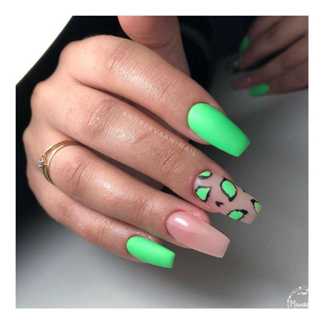 В новом сезоне специалисты решили отодвинуть на второй план серые оттенки, и предложить модницам свежий трендовый зеленый цвет и гамму его оттенков. Он входит в число универсальных, впишется в любой образ. Ко всему прочему, на нем можно отобразить множество рисунков и узоров. Модными являются все оттенки — от светлого до темного. Помимо него, тенденции маникюра 2020 года предусматривают следующие цвета: