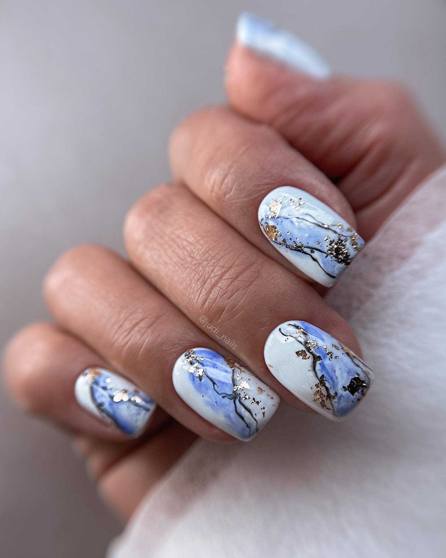 - Голубой оттенок обретет особую популярность летом, особенно в морских мотивах. Дополнительно цвет можно использовать зимой в качестве подложки под снежные и вязанные узоры. В основном не рекомендуется выбирать однотонную покраску в этом оттенке, оформлять ноготки пейзажными рисунками и всевозможными узорами.